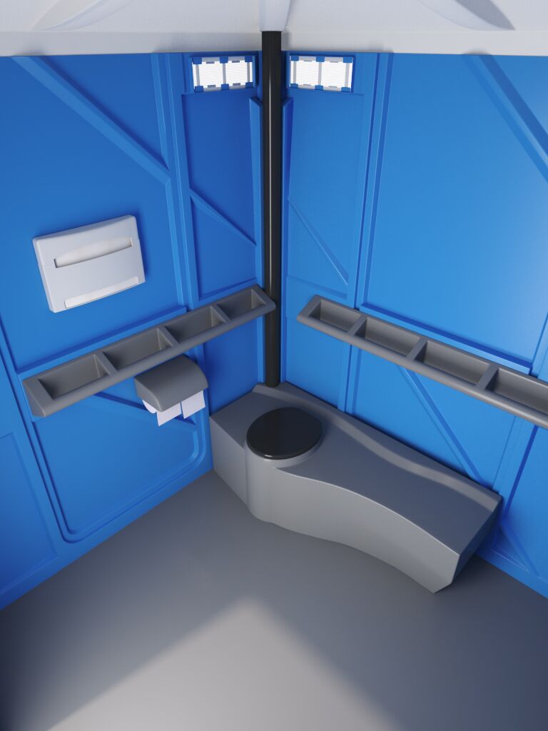 Wheelchair Accessible Portable Restroom unit provides adequate wheelchair turning space and handrail placements for comfortable movement.
